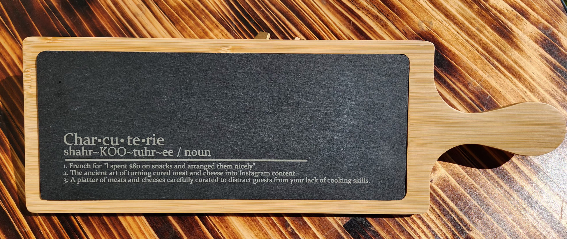 Introducing the perfect addition to your kitchen: Bamboo and Slate Charcuterie - a quality, useful and decorative set that is sure to impress your guests. With a funny definition engraved on the slate, this charcuterie set is not only functional but also adds a touch of humor to any gathering. Elevate your hosting game now!